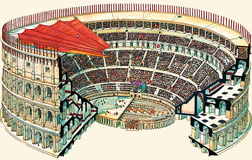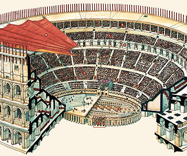 Entre os toldos mais significativos do mundo antigo estava o velário , o enorme complexo de estruturas de sombra retráteis que podiam ser implantadas acima das áreas de assentos do Coliseu Romano . Feito de telas de sombra de linho, estrutura de madeira, soquetes de ferro e corda, o sistema podia efetivamente sombrear cerca de um terço da arena e dos assentos; outro terço podia ser sombreado pelas altas paredes ao redor, proporcionando à maioria dos assentos alguma sombra em uma tarde ofuscante. Acredita-se que os marinheiros, com sua experiência em fabricação de velas e cordame , foram empregados para construir, manter e operar o velário.